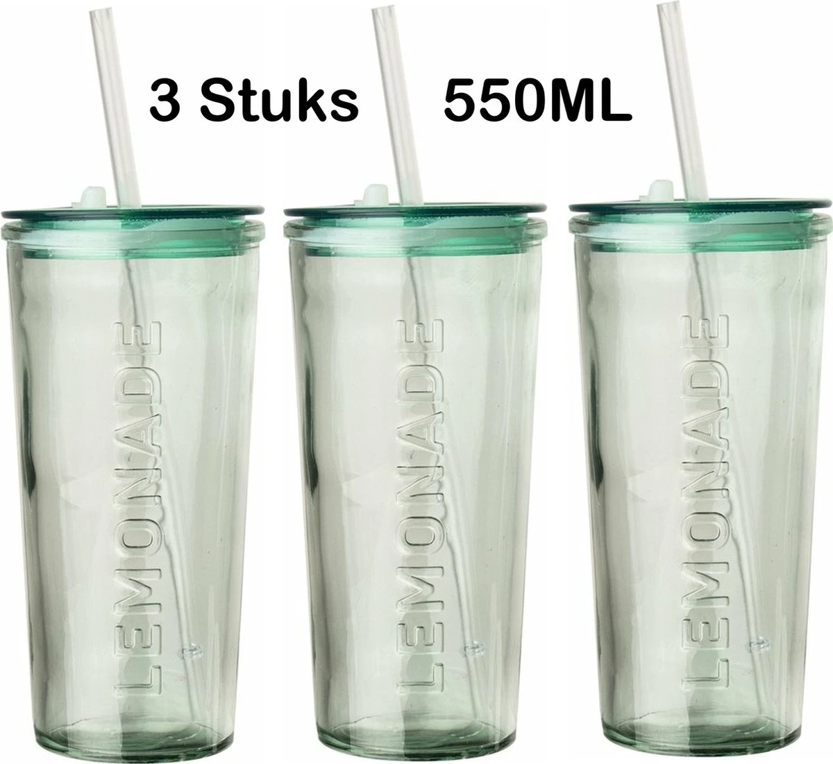 3 Stevige drinkglazen met een inhoud van 550ml, de drinkglazen zijn voorzien van een kunststof deksel en een rietje