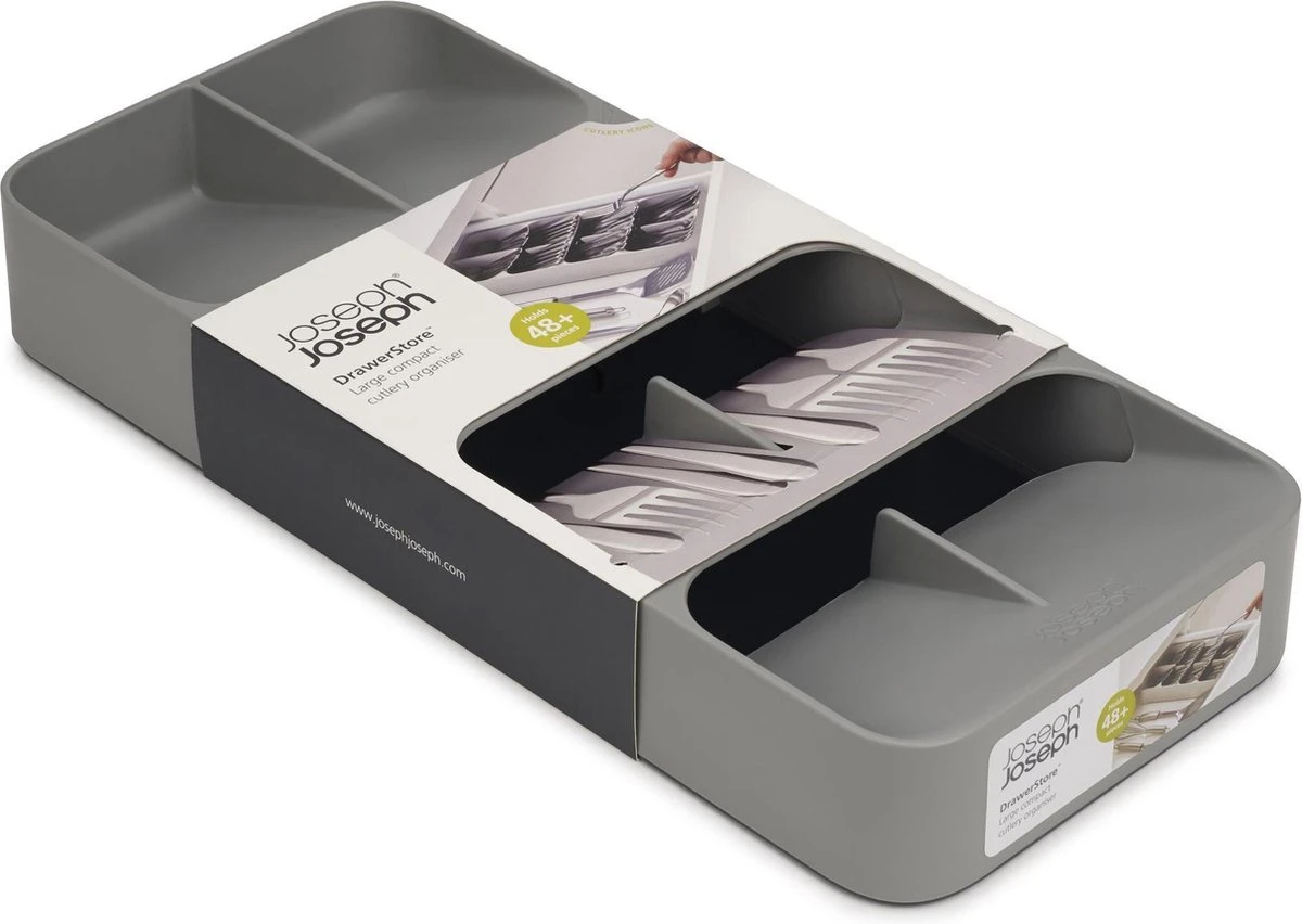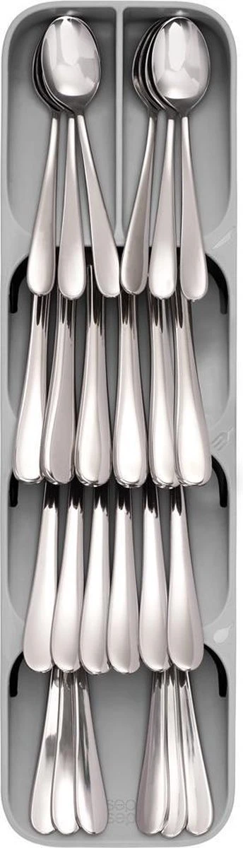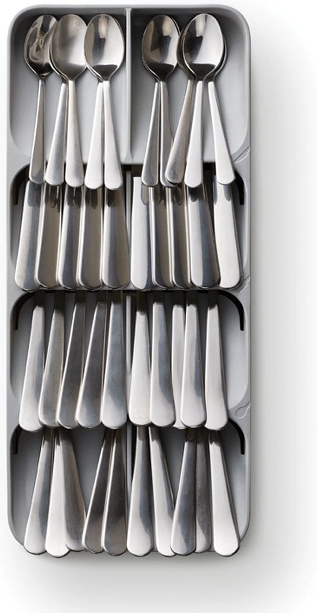 Met deze bestekbak van het merk Joseph Joseph kun je de ruimte in je keukenlade optimaal benutten – ideaal voor kleine keukens! De unieke constructie van deze keukenlade organizer creëert ruimte voor messen, vorken en lepels die in conventionele bestekdozen minstens twee keer zoveel ruimte nodig hebben.