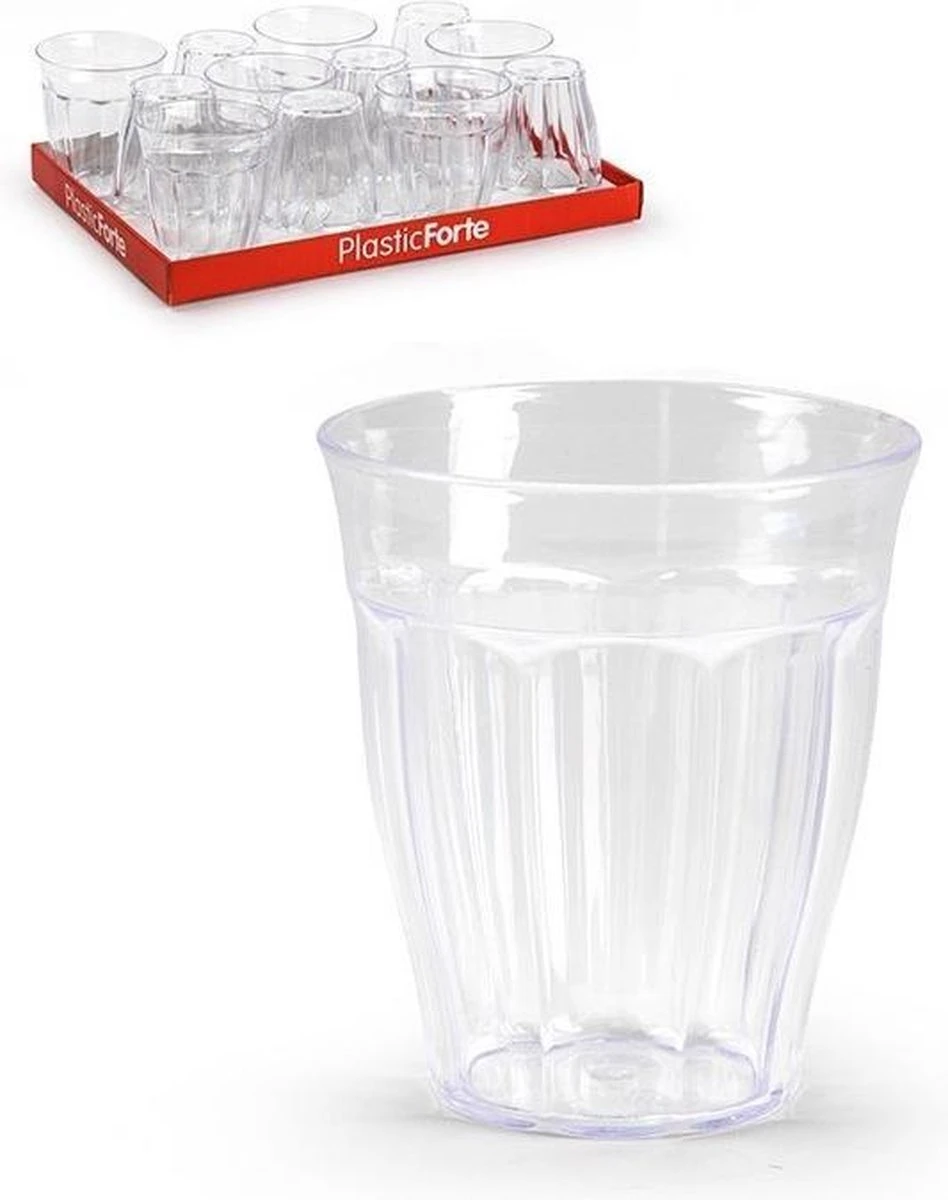 12x Kunststof drinkglazen/waterglazen Picardie transparant 250 ml. 12 onbreekbare transparante water/sap glazen, met ieder een inhoud van 250 ml. De glazen gemaakt zijn van transparant sterk kunststof en daardoor ideaal voor gebruik door kinderen en/of op de camping of bij een picknick. Picardie glazen hebben een tijdloos en ergonomisch ontwerp en zijn stapelbaar, waardoor ze weinig ruimte innemen in het keukenkastje. Aantal glazen: 12x stuks. Materiaal: kunststof. Afmeting per glas: ca. 8 x 8 x 9 cm. Inhoud per glas: 250 ml. Type: Picardie. Vaatwasmachinebestendig: ja, geschikt voor in de vaatwasser. Drinkglazen/waterglazen keuken benodigdheden/accessoires. Stapelbare glazen.