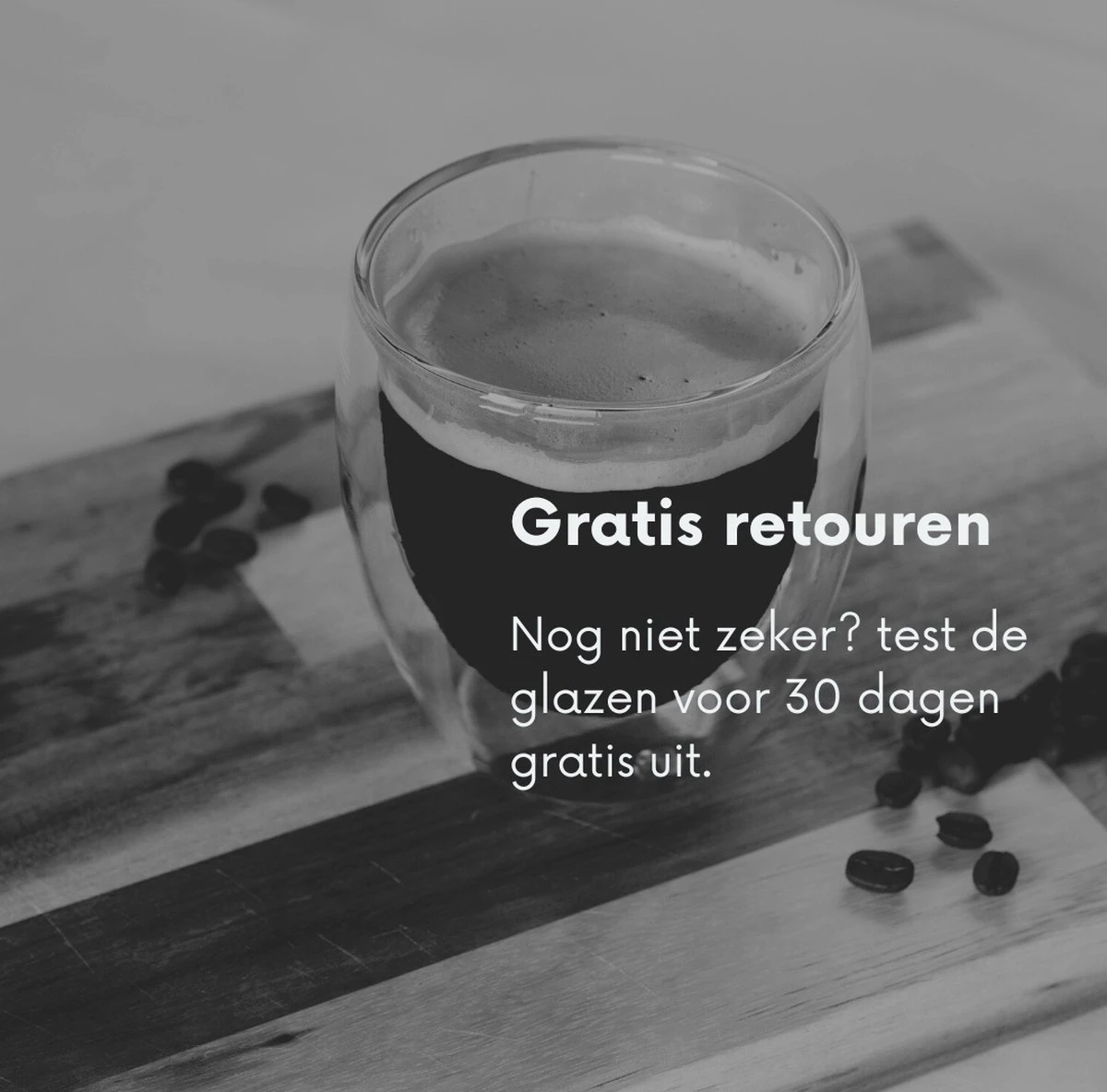 …als je nu besteld heb je 30 dagen bedenktijd en gratis verzending + retouren, wacht dus niet langer en besteld nu jouw Luxe thee/koffie glazen en ontvang de glazen binnen 1 of 2 werkdagen.