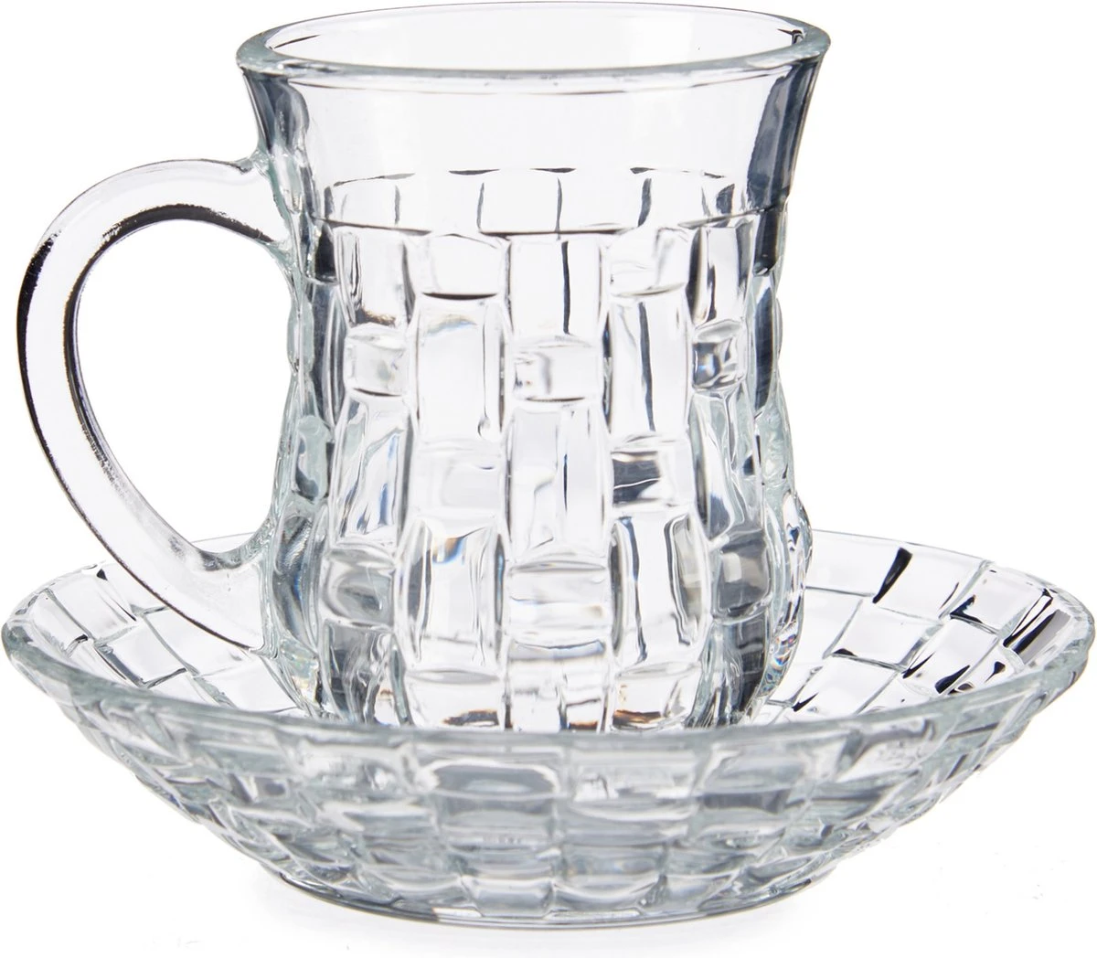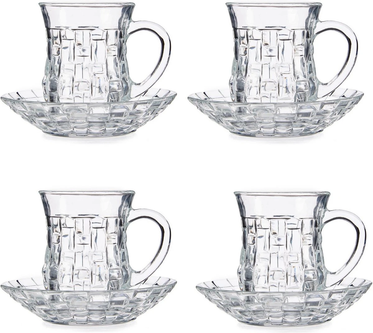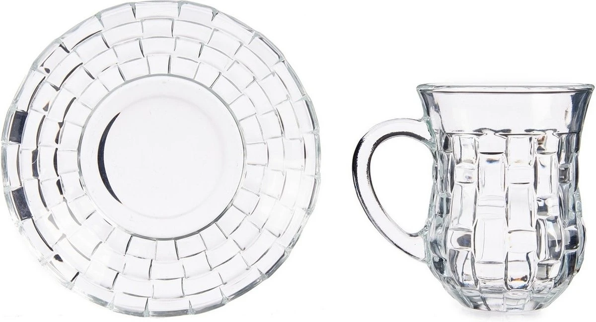Set van 8x stuks Marokkaanse theeglazen inclusief schotel 125 ml. De glazen zijn perfect voor een heerlijke kopje thee, maar zijn ook geschikt voor koffie of andere warme dranken. Geschikt voor in de vaatwasser. Materiaal: glas. Afmeting per glas: ca. 9 x 6.5 x 8.5 cm.