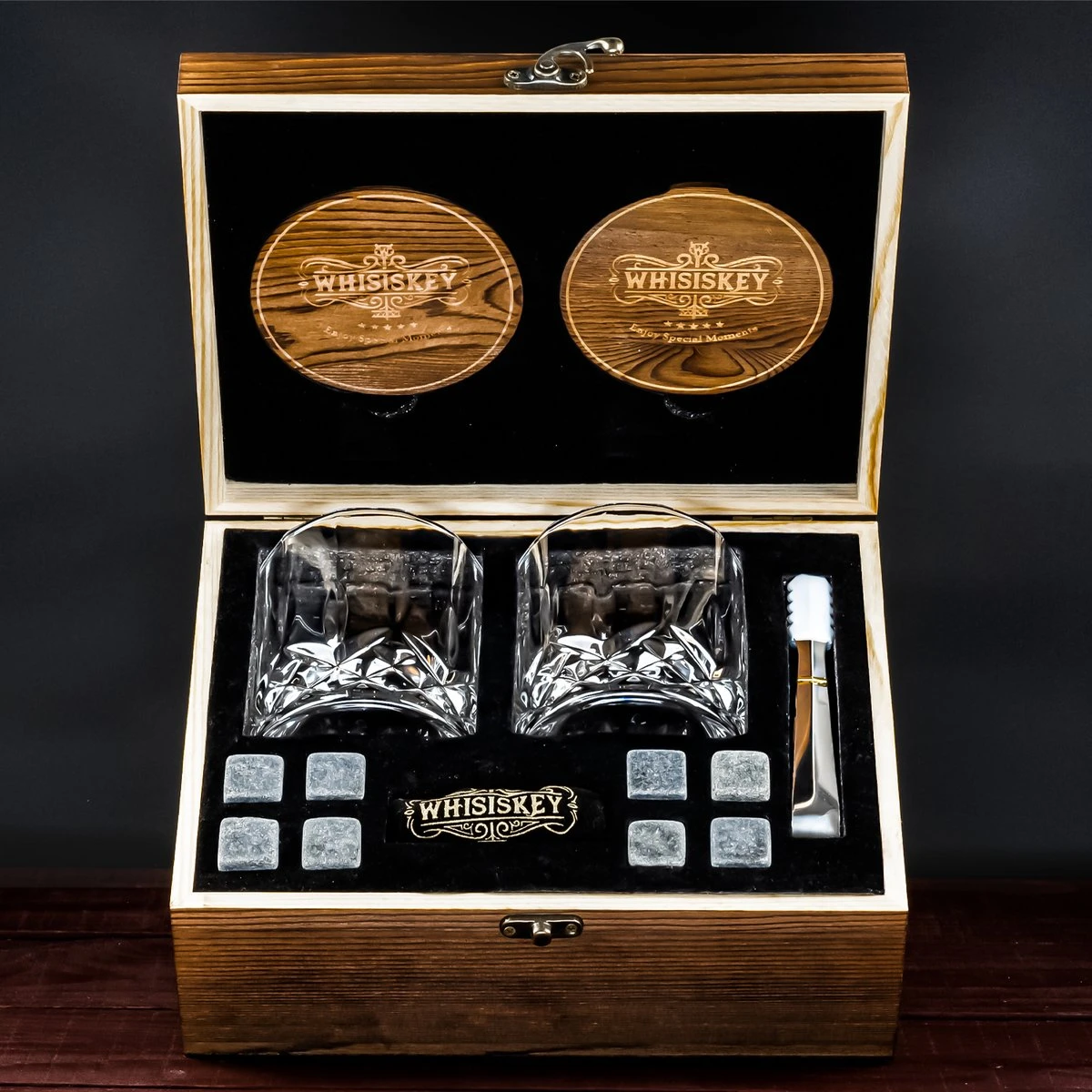 Trakteer jezelf of een andere op deze whiskey geschenkset. Een complete set om nog meer uit jouw whiskey moment te halen. De set bevat twee zware tumbler whiskey glazen, 8 granieten whiskey stenen, een opbergzakje om de stenen netjes bij elkaar te houden en ijstang en een setje houten onderzetters. Dit allemaal netjes verpakt in een luxe houten giftbox.